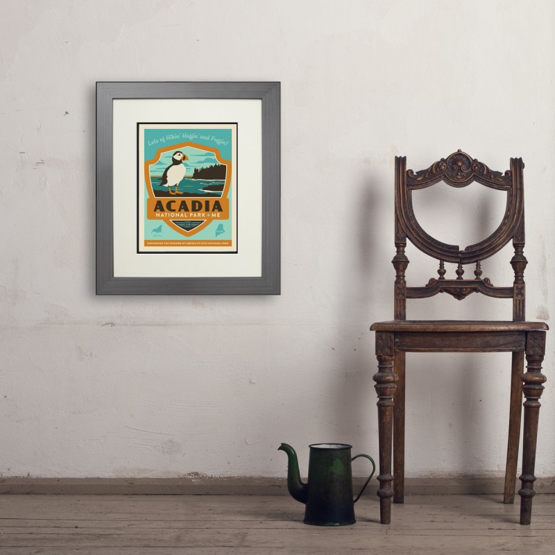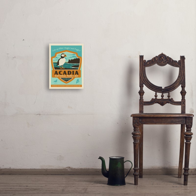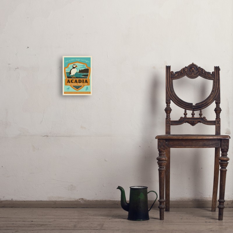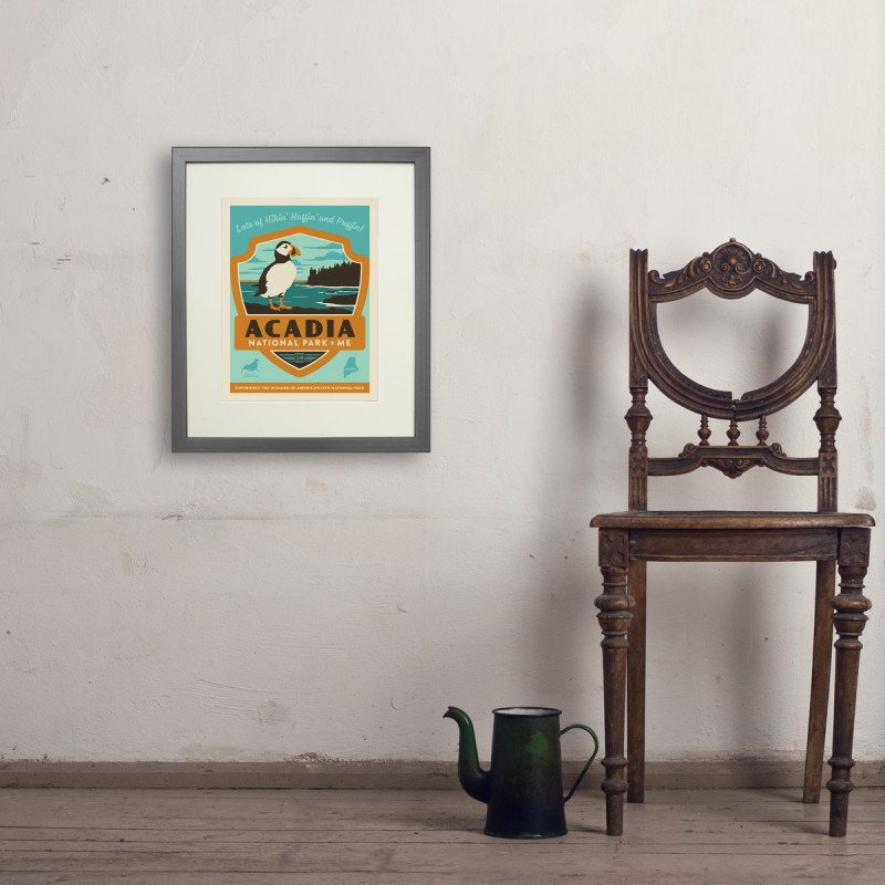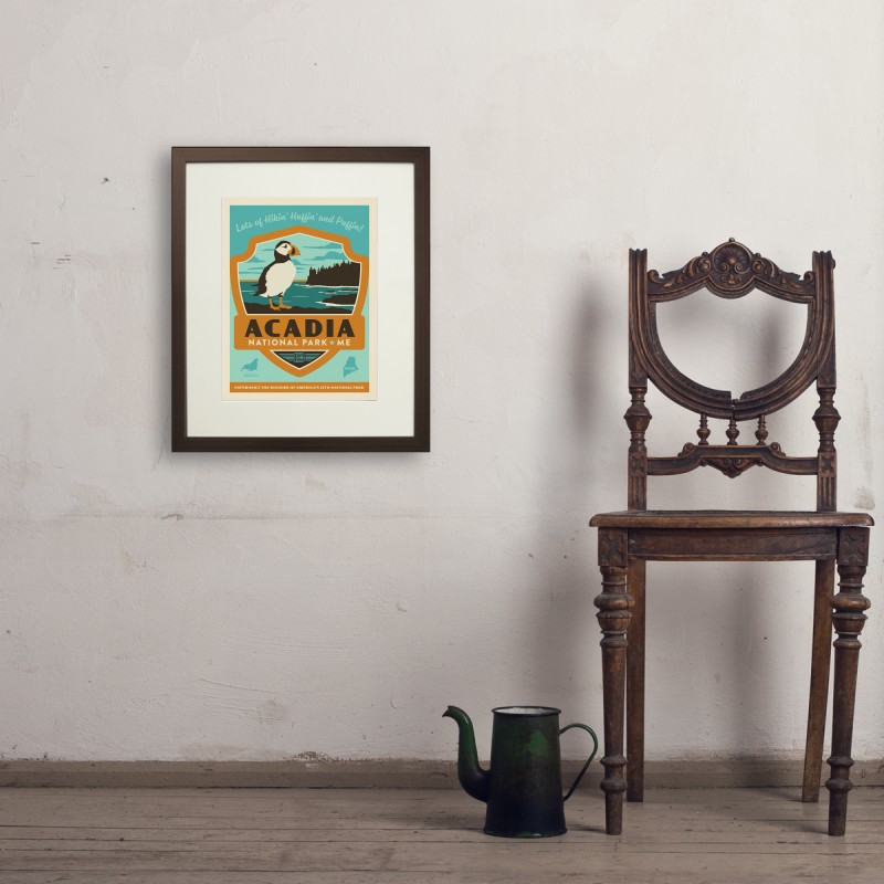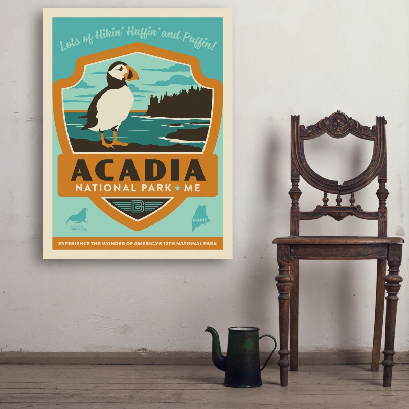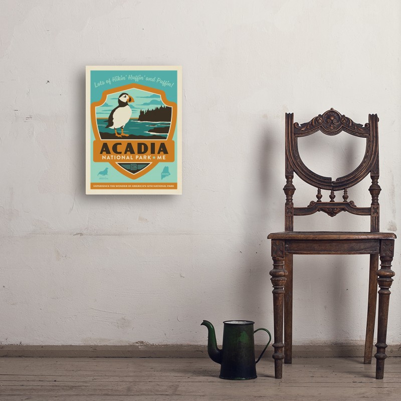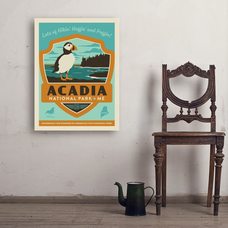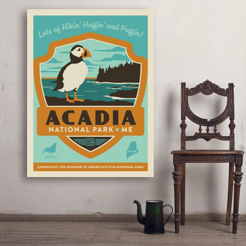 All across the picturesque Mount Desert Island, carriage roads allow visitors to travel Acadia National Park by foot, bicycle, or horseback (no cars allowed). And this island park is best enjoyed without the rumble of an automobile, especially if visitors hope to catch a glimpse of an elusive Atlantic puffin, pictured here. Acadia National Park is known for its rich biodiversity and roaring seashore, rocky headlands, and deep evergreen woods. Our artists at Anderson Design Group honored the park with its own vintage poster emblem, a badge designed in the WPA-commissioned style of the early 1900s. To learn more about the park and how to just about guarantee a puffin sighting, check out the Friends of Acadia group.