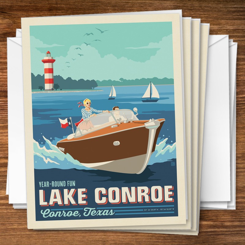 Conroe, Texas is home to all kinds of recreational opportunities, one being the year-round vacation hotspot of Lake Conroe. A popular attraction for visitors and residents alike, Lake Conroe is a 21,000 acre body of water that is perfect for boating, jet-skiing, and fishing. The lake is surrounded by pine woods and a few sandy beaches. Eternalizing the lake in a mid-century illustration reminiscent of the Golden Age of Illustration, Anderson Design Group handcrafted our own vintage American Travel art rendition of this pleasant recreation destination. Perfect for any home’s decor, you can remember a trip to the lake with an art print, canvas banner, metal sign, framed postcard, or canvas of this original Joel Anderson design. To learn more about the lake and nearby activities, be sure to check out the Conroe Convention & Visitors Bureau.