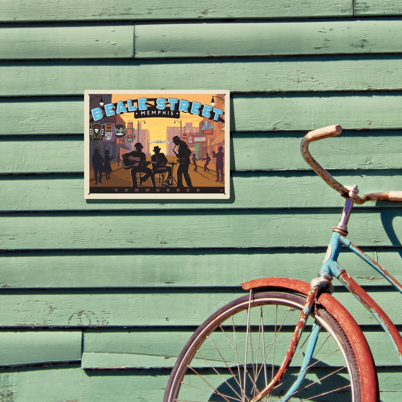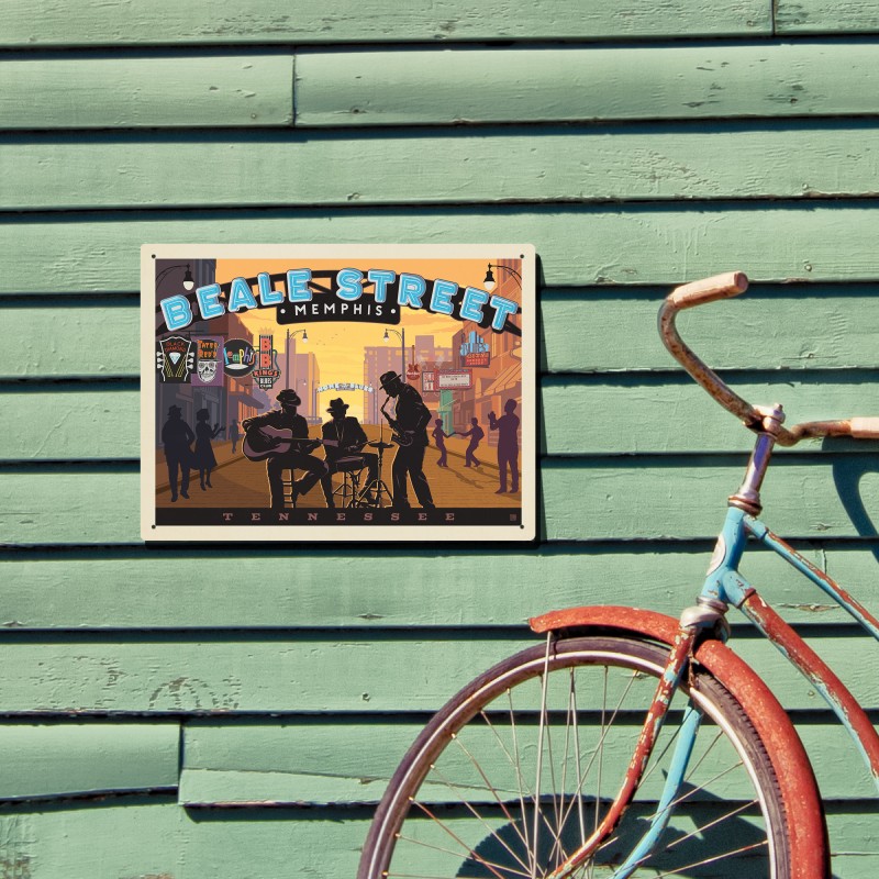 Hear the Blues on every street corner or poke your head into a bar and listen to Soul music or Rock 'n' Roll on Memphis’s historic Beale Street. This street has been entertaining guests and locals alike since 1841 when the street was first developed as an entertainment district by entrepreneur Robertson Topp. Today, visitors from all over the world come to hear live music and to enjoy the authentic food and drink that Beale Street has to offer. Some estimates indicate that 11 million people visit Beale Street every year! Inspired by the immortal nature of this around-the-clock hub for entertainment, Anderson Design Group handcrafted vintage poster art of the street, fashioning the artwork after early-20th century WPA-commissioned artwork. To learn more about entertainment opportunities on Beale Street, click on over to Memphis Travel.