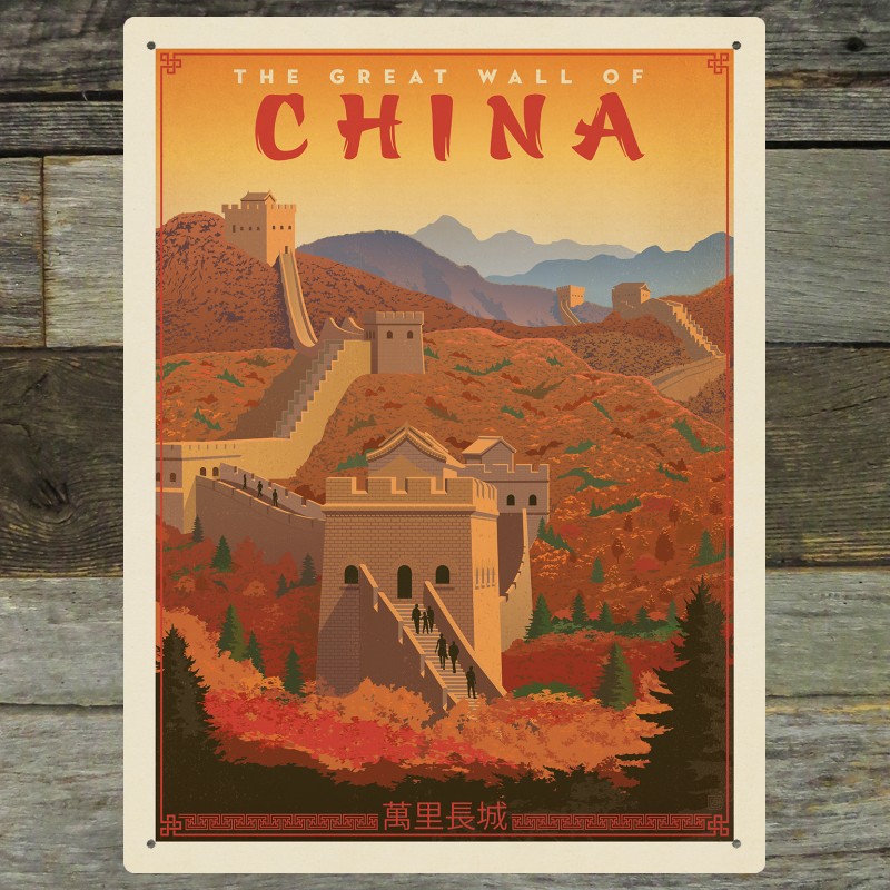 One of the Seven Wonders of the World, the Great Wall of China represents a heroic feat of engineering, dedication, time, and sheer hard work. The wall is the longest manmade structure in the world, running a course of over 13,000 miles! The wall was built over hundreds of years, construction beginning 2,300 years ago and ending in the 1600s. The wall is one of the most-visited attractions in the world, with one record-breaking year bringing about 63 million visitors to the wall. Inspired by the wall and the majesty it represents, Anderson Design Group crafted a vintage travel poster of the wall, a landscape depiction in classical styles of the wall and the surrounding countryside. To learn more about the wall and the best places to visit it, check out this Travel China Guide.