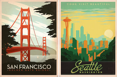 ADG set out to celebrate the history and charm of America’s favorite destinations in a series of classic travel posters after Creative Director Joel Anderson got fed up with the cheesy, low-quality postcards & prints available in the gift shops of his favorite places. So he began directing a little symphony of artists who interned at his firm, guiding them in the creation of new imagery in the style of the Golden Age of Poster Art. The new “vintage travel” designs are sold as limited edition prints at www.ArtAndSoulOfamerica.com and licensed to stationery and gift companies for the production of not-cheesy keepsake items and memorabilia. Special thanks to interns Julian Baker & Andy Gregg.