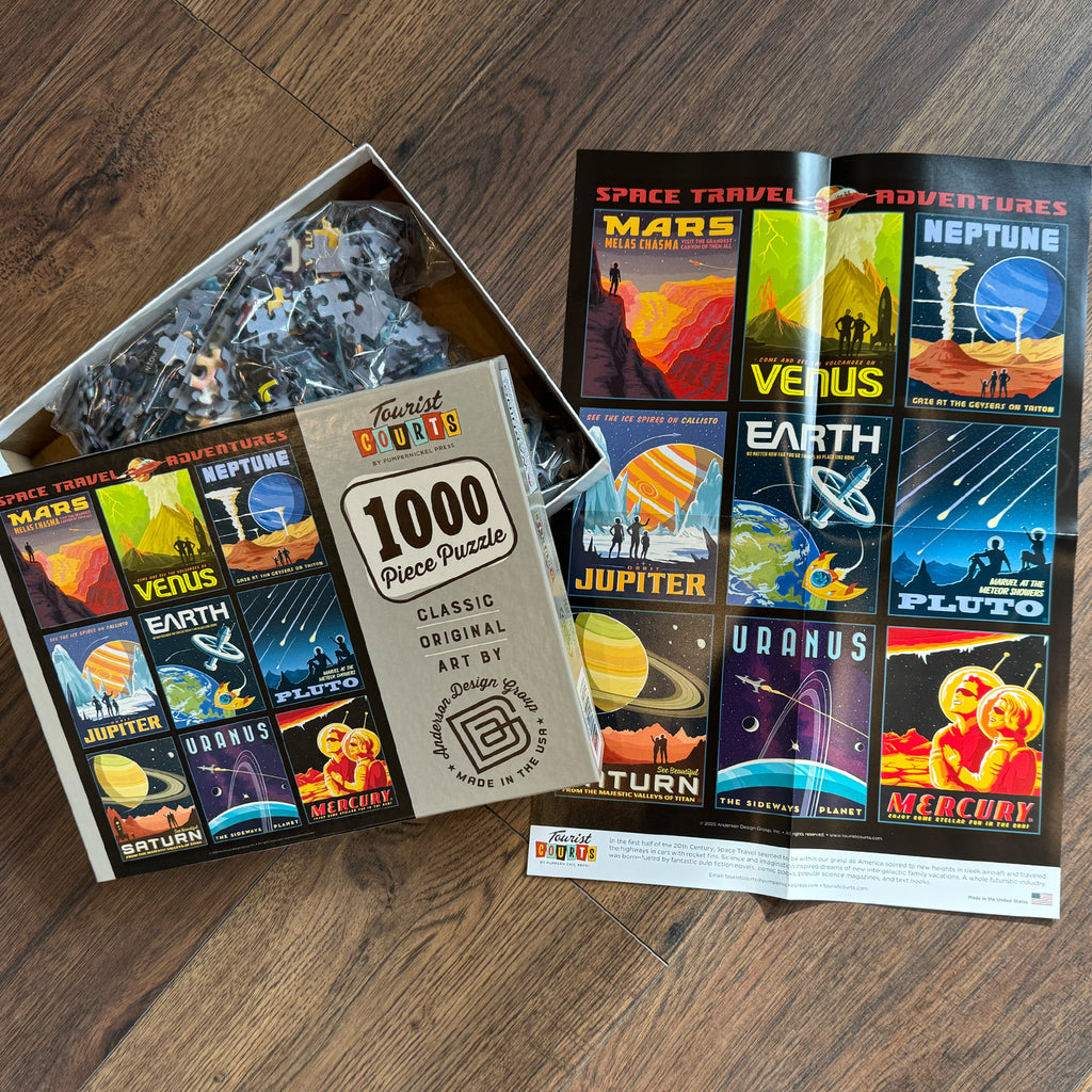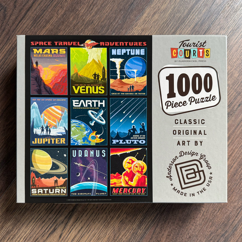 Puzzled about what to buy the space cadets in your life? Give them our deluxe 1,000-piece jigsaw puzzle, featuring a collage of our most popular Space Travel designs! Created by the talented artists of Anderson Design Group in partnership with our friends at Tourist Courts, this puzzle is beautiful, top-quality, Made in the USA, and fun for all puzzlers. Each finished puzzle measures 18" x 24". Recommended for ages 10 and up!