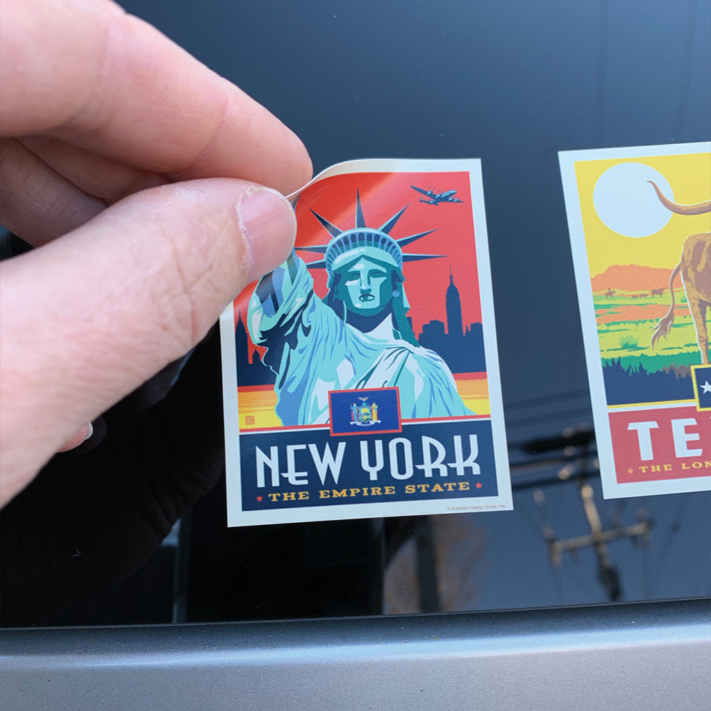 Show your State Pride and your sense of adventure with this all-American set of indoor/outdoor vinyl stickers. They are made in the USA by Retro Planet for Anderson Design Group and printed in gorgeous colors on premium grade vinyl. Stick them on your car, trailer, cooler, computer, (or almost anything) to show where you've been—or where you want to go! This deluxe set features one sticker for each of the 50 States in the USA. Each sticker is 2.25 inches wide x 3 inches tall (5.5 cm x 7.5 cm). Fun for all ages!