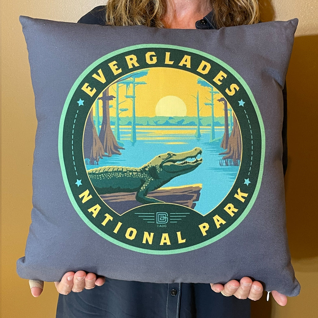 This decorative Everglades National Park throw pillow will spice up any sofa, bed, or futon. The sturdy yet comfy outer cover is beautifully printed with one of our favorite designs (full-color art on the front, and classic black on the back). It comes with a hidden zipper at the bottom so you can remove the plush foam cushion to wash the pillow cover. Measuring 18" x 18", this accent pillow is the perfect size for tossing anywhere you need a splash of color (it's also the ideal shape and size for napping, watching nature documentaries, and the inevitable pillow fight). Collect our stylish pillows and decorate with your favorite memories.