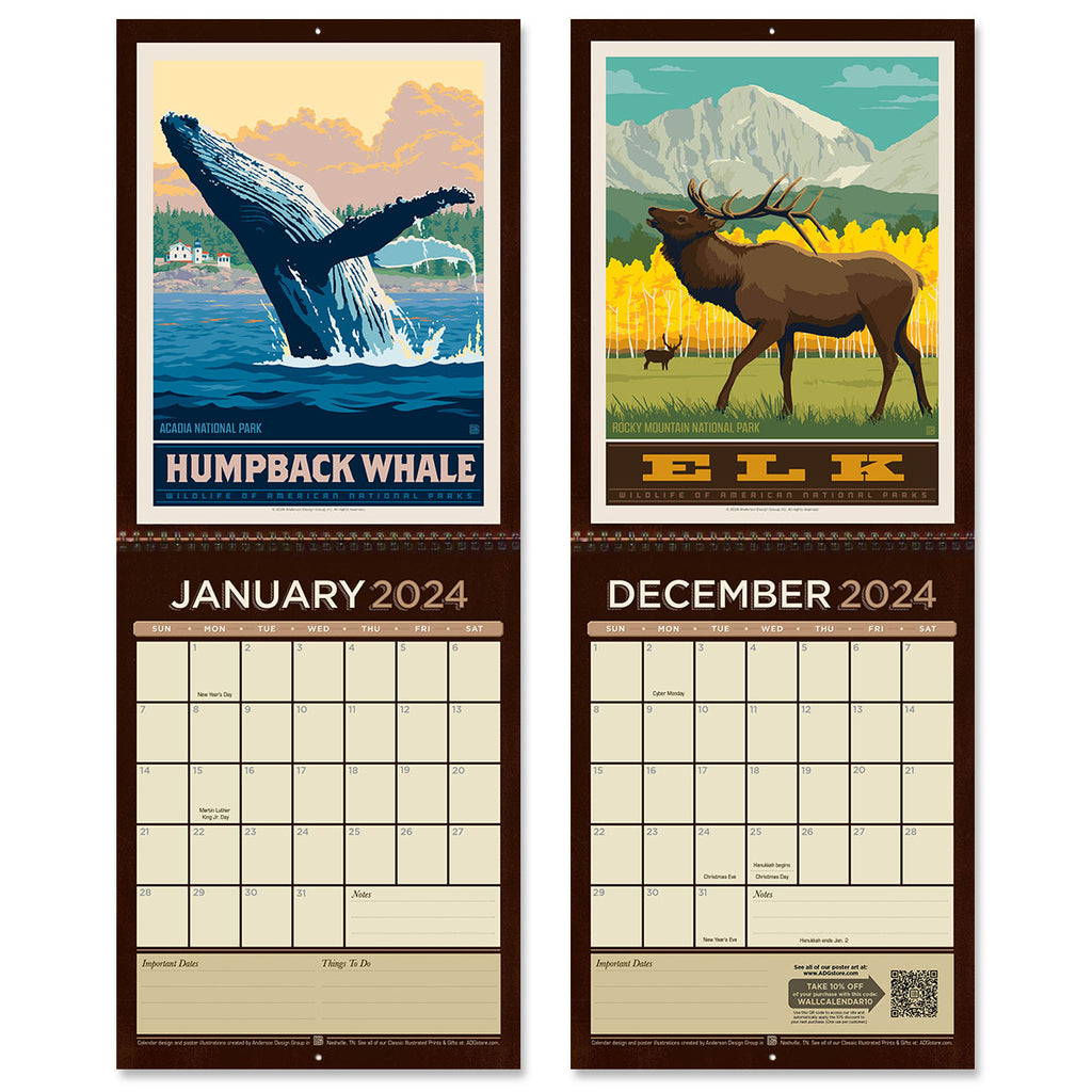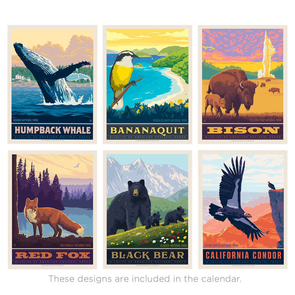 This classic 10"x13" wall calendar features 12 of our most popular National Park designs. When open, the calendar is 10" wide by 26" tall and features a generous amount of space to write notes about things to do, parks to visit, and wildlife to search for!