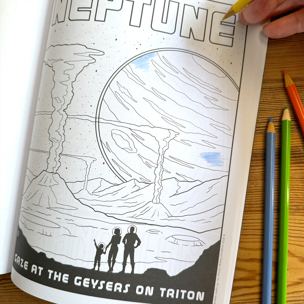 This deluxe 60-page coloring book is perfect for coloring enthusiasts of all ages and skill levels. We took our popular Space Travel poster art and redrew each composition by hand to create 48 coloring pages that feature our favorite outer space posters. We also included 8 full-color pages with reference imagery of our original poster designs, plus educational text about the history of human space exploration. This deluxe 8.5" x 11" coloring book is printed on gallery-grade drawing paper. Created for use with crayons, colored pencils or felt tip markers, this beautiful and educational book offers hours of coloring fun! It's simply out of this world!